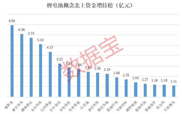 除了部分机构预期较好外,北上资金似乎也在抄底一些核心标的。数据宝统计,按照1月成交均价粗略计算,截至1月10日,北向资金合计加仓锂电池板块逾48亿元。具体看,包括璞泰来、德方纳米、赣锋锂业、永太科技等个股,北向资金均增持逾5亿元,亿纬锂能、杉杉股份、华友钴业等10多只个股增持超亿元。