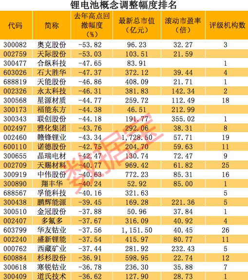 不过,在锂电池板块,天际股份的调整幅度并不是最大的。奥克股份去年最高价超过30元,最新价不足15元,最大跌幅接近54%。这两只股票也是锂电池板块“唯二”跌幅超过50%的锂电池个股。值得一提的是,目前已经有17只锂电概念股最新价较去年以来高点跌超40%。这一数据意味着,回调幅度40%的锂电股,排不进跌幅榜前十。