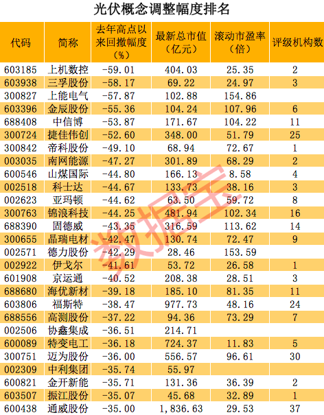 光伏板块的调整幅度也较为明显,上机数控、三孚股份、上能电气等6只个股回调超50%,帝科股份、南网能源、山煤国际等10多只个股跌超40%。部分光伏龙头同样出现在跌幅榜前列,包括上机数控、捷佳伟创、锦浪科技等个股,最新市值依然均在300亿元以上。风电概念方面,日月股份、运达股份等个股调整逾40%。