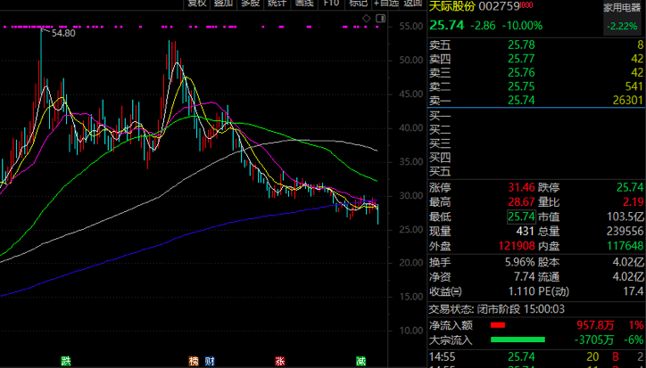 1月10日晚间,天际股份发布公告称,因信息披露、财务核算、内幕信息管理方面存在问题,公司相关责任人收到广东证监局出具的警示函。今天该股低开低走,收盘跌停。按照最新价与去年最高点相比,该股跌幅超过53%。