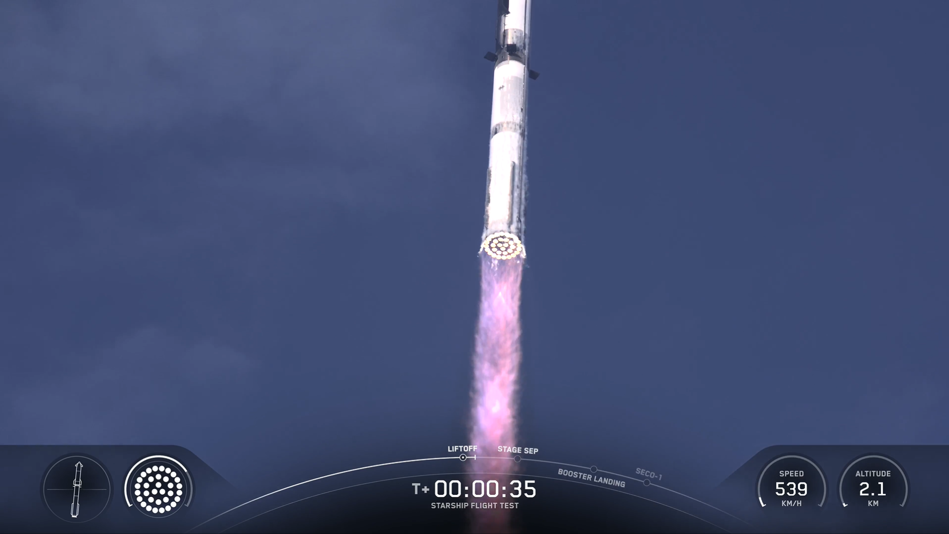 根据直播画面,当地时间6时40分左右,搭载了B14.2超重型助推器和S35飞船的火箭顺利发射升空。其在前期的上升推进阶段进展顺利,升空5分钟后,超重型助推器开始快速下降。