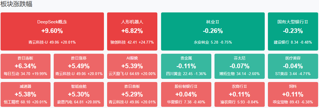 板块方面,DeepSeek、机器人、半导体、无人驾驶、稀土永磁等板块均有不俗表现;贵金属、猪肉养殖板块表现落后。