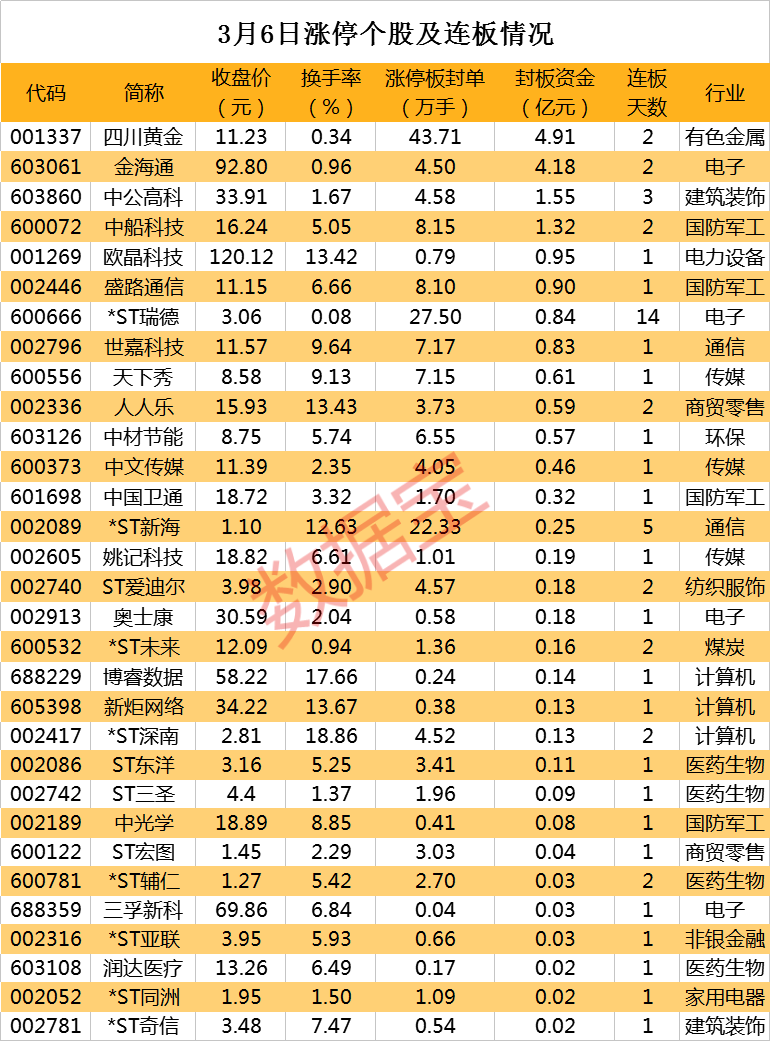 从收盘涨停板封单量来看,四川黄金备受资金追捧,涨停板封单有43.71万手;其次是*ST瑞德、*ST新海,涨停板封单分别为27.50万手、22.33万手。