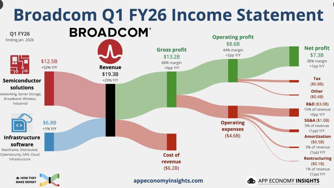 最新业绩指标方面,在截至2月1日的第一财季,博通总营收增至193亿美元,意味着同比大幅增长29%;不计某些项目后,调整后的每股收益为2.05美元,两者均高于分析师们此前平均预期的营收约192亿美元以及每股收益约2.03美元。