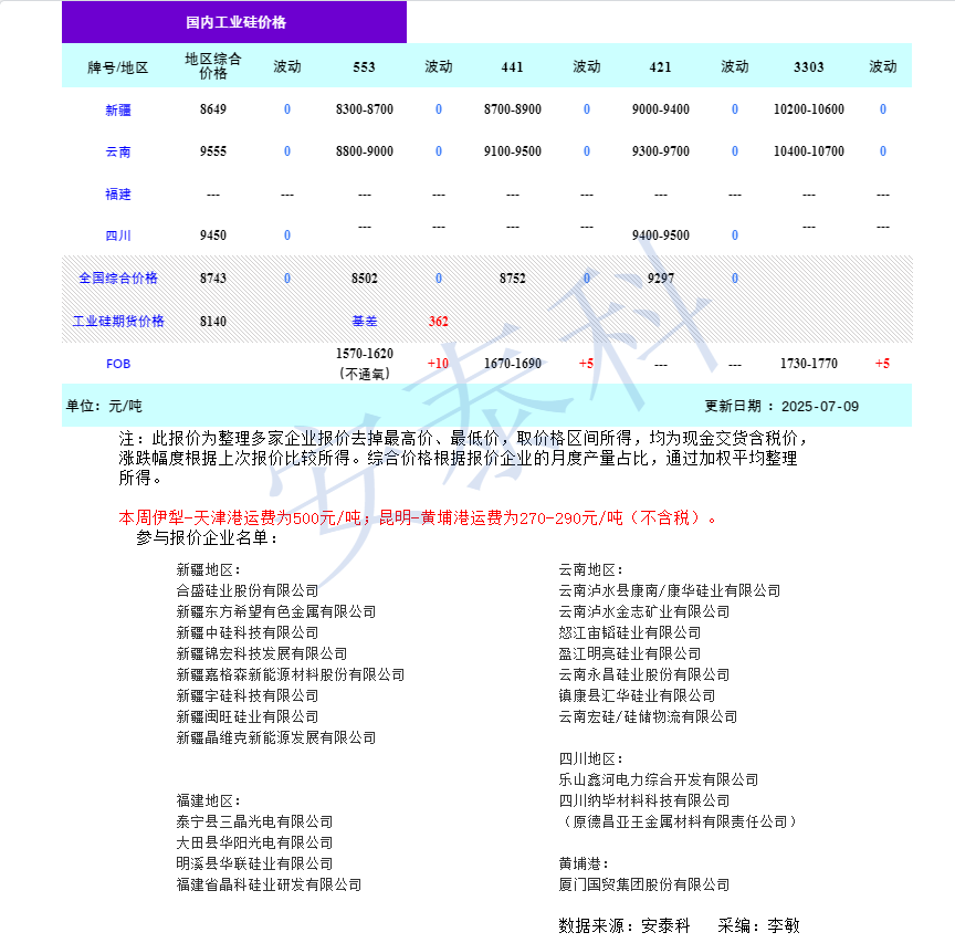 7月9日,硅业分会发文称,本周工业硅现货价格持稳。过去一周(2025年7月3日-9日),主力合约收盘价从8010元/吨震荡波动至8140元/吨,涨幅为1.62%。全国综合价格和各地区综合价格持稳。FOB价格上涨5-10美元/吨,主要原因还是受汇率上涨和期货盘面回弹影响。