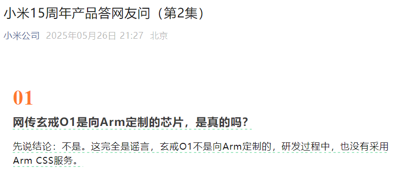 5月26日,小米公司在小米15周年产品答网友问(第2集)中回应“网传玄戒O1是向Arm定制的芯片”时表示,这完全是谣言,玄戒O1不是向Arm定制的,研发过程中,也没有采用Arm CSS服务。