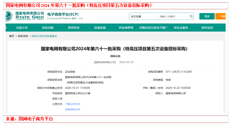 事件:2024年9月30日,根据国网电子商务平台,国家电网发布2024年特高压项目第五次设备招标采购公告,包含换流阀、变压器、组合电器等重点设备,应用于今年开工的阿坝-成都交流、甘肃-浙江柔直、陕北-安徽直流等特高压线路。