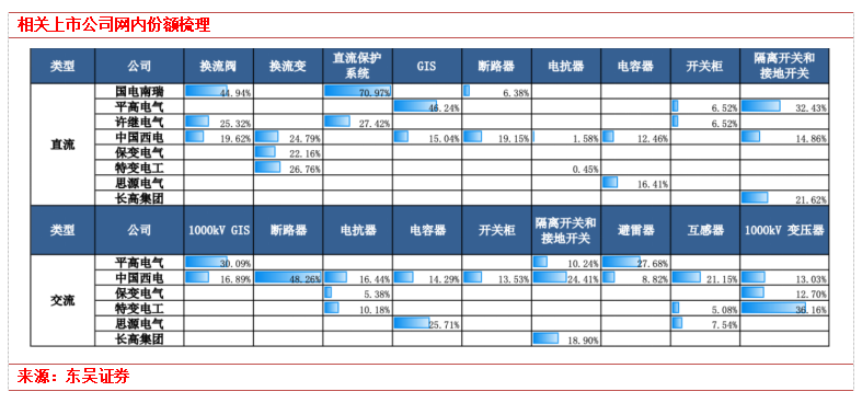 从产业链价值量来看,换流阀、换流变、直流控保是特高压直流中的核心主设备,格局非常集中,换流阀及直流控保主要以国电南瑞、许继电气以及中国西电为主,换流变主要以中国西电、保变电气、特变电工为主。