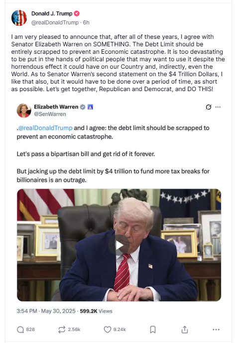 特朗普分享了沃伦上周五在社交媒体平台X上发的帖子。沃伦当时表示,她同意特朗普的观点,即“应该取消”债务上限,并呼吁通过两党法案“永远摆脱它”。特朗普还表示,在这个问题上他“一直同意她(沃伦)的观点”,并补充说,他还没有和她私下谈过此事。