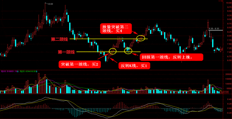 2) 上涨时突破颈线阻力位,且最好放量突破,得到量能的验证,为第二买入点位。