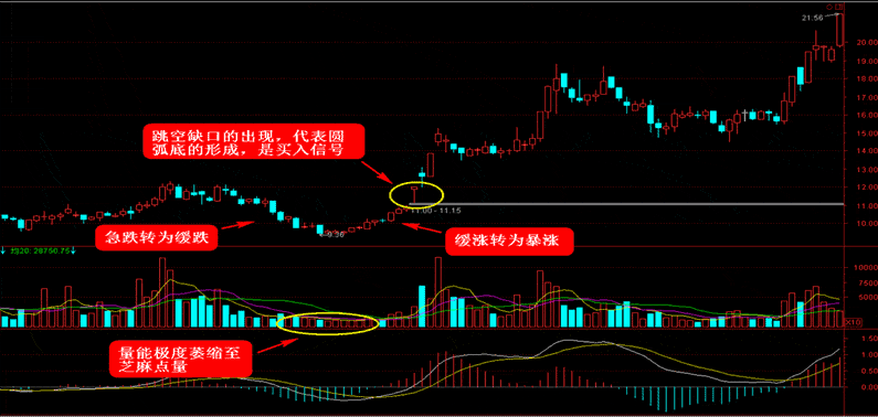 圆弧底形态通常出现在市场下跌末期,行情由急跌逐步过渡到缓跌、缓涨,最后跳空暴涨,意味着圆弧底完成。圆弧底形态的唯一可靠买点是放量上涨的跳空缺口,圆弧底形成时间越长,可靠性越强,涨幅越大。若中长期均线向上,那么后市上涨的确定性更强。