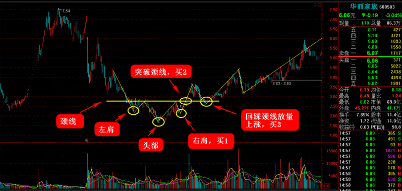 3)突破颈线上涨一波后回抽不破颈线,再次放量上涨时为第三买入点位。