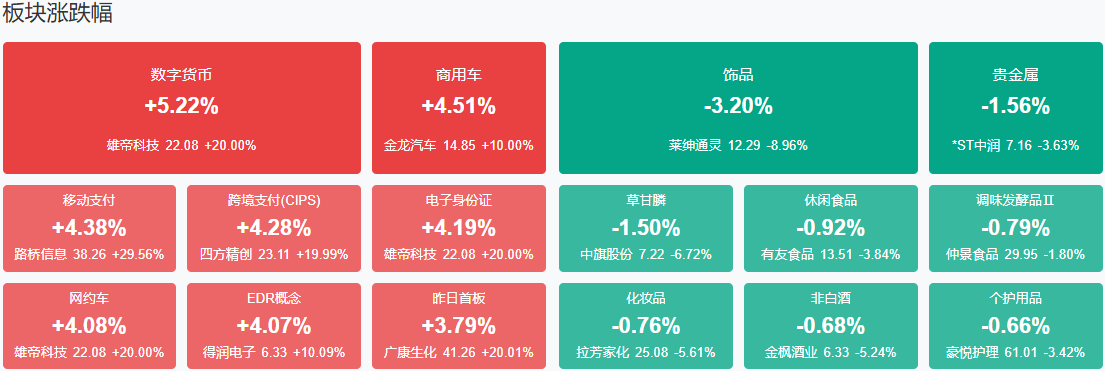 板块方面,无人车辆、数字货币、汽车整车、创新药等板块涨幅居前,草甘膦、黄金、食品、白酒等板块跌幅居前。截至收盘,沪指涨0.72%,深成指涨1.12%,创业板指涨1.16%。