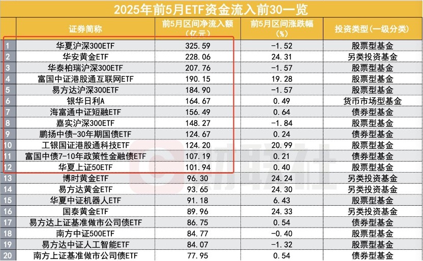 华夏沪深300ETF获得最多买入,前5个月净流入325.59亿元,比第二名华安黄金ETF流入多百亿,华安黄金ETF作为另类投资基金,年内净流入资金达228.06亿元,值得注意的是,该基金也是流入超百亿ETF中回报率最高的基金,前5个月涨幅达到24.31%,可谓越涨越买。