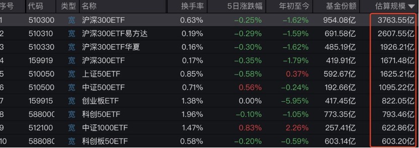 二是沪深300ETF整体规模再次破万亿。就在贸易摩擦之后,国家队再次入场,4月15日,全市场24只沪深300ETF整体规模已达到10038.67亿元,再次突破万亿元,这也是我国唯一一个规模突破万亿元的宽基ETF赛道。