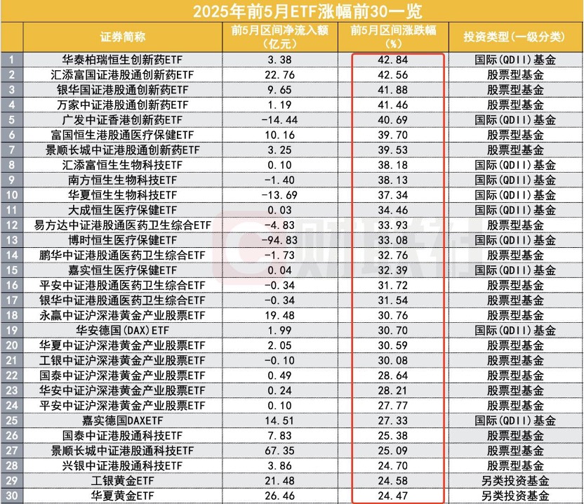 截至5月底,华泰柏瑞恒生创新药ETF年内涨幅42.84%,成为ETF的冠军。医药主题ETF业绩包揽了ETF回报率排名的前17个席位。紧随华泰柏瑞恒生创新药ETF之后的事,汇添富、银华、万家、广发等创新药主题ETF。排名居前的除了创新药,还有生物科技、医疗保健、医药卫生等相关主题ETF,回报率均超过30%。