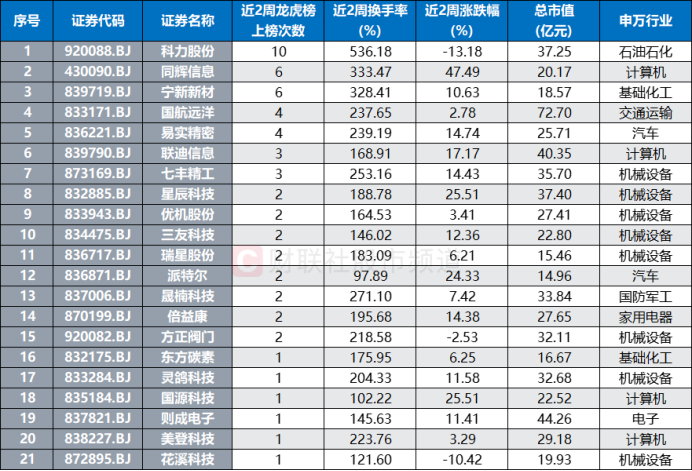 此外,近期也有不少北证人气标的登上龙虎榜单。截至6月30日数据,不计算ST及新股,累计共有21股近2周行情中一度上榜。其中,科力股份累计登榜10次,规模远超同时位居第二位的同辉信息、宁欣新材(均为6次)。同样分行业统计,上述这20余股多集中在机械设备、计算机板块,其两者合计占比近55%,同时还涵盖基础化工、汽车、电子等板块。