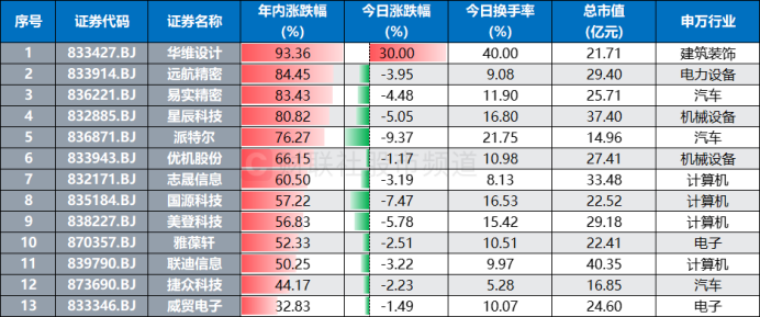 个股层面来看,不少北证标的也在今日或近日股价录得历史最高点。截至今日收盘,累计共有13只北证A股近5日行情中一度创上市以来新高,其中,华维设计于今日创历史新高。分行业(申万一级)来看,上述13只“北证新高股”中,计算机、汽车股数量相对较多,其两者合计占比近53.8%,同时还涵盖电子、机械设备、电力设备、建筑装饰板块。