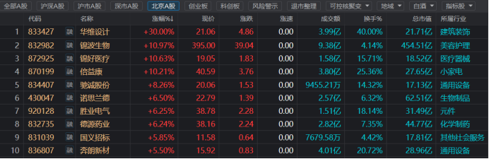 今日(7月1日),北证市场继续活跃,截至收盘,华维设计获30cm涨停,锦波生物、锦好医疗、倍益康涨幅均在10%以上。同时,驰诚股份、诺思兰德、胜业电气、德源药业等股也涨幅居前。