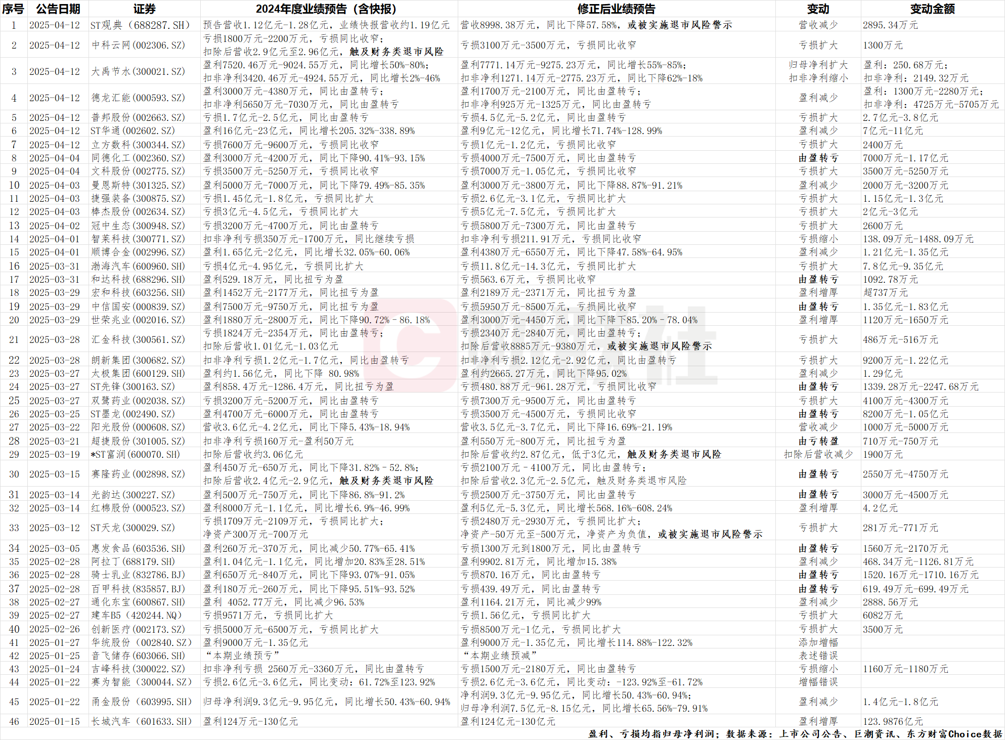 而据财联社记者不完全统计,截至4月12日,A股业绩预告出现大幅修正的上市公司已接近50家,其中近八成为向下修正:幅度最大的是ST华通,盈利缩水超过7亿元;亏损额度最大的是渤海汽车(600960.SH),预计亏损超过11.8亿元。更有同德化工(002360.SZ)、赛隆药业(002898.SZ)、光韵达(300227.SZ)、ST墨龙(002490.SZ)、惠发食品(603536.SH)等10家上市公司业绩直接由盈利转为亏损,医药、消费、汽车、传媒等行业均有公司出现业绩大幅下修。