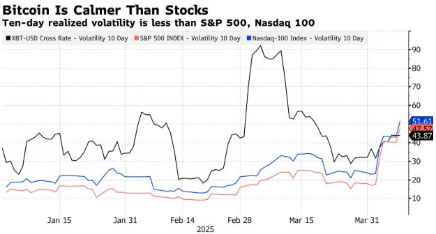 特朗普关税政策引发美国股市的波动幅度超过了比特币,这是对历史波动趋势的罕见逆转——比特币波动水平这场较股市更高。比特币在过去10个交易日的实际波动率为43.86,低于标普500指数的47.29和纳斯达克100指数的51.26。虽然加密期权市场的短期波动性有所增加,但从长期来看,交易员仍然看涨。