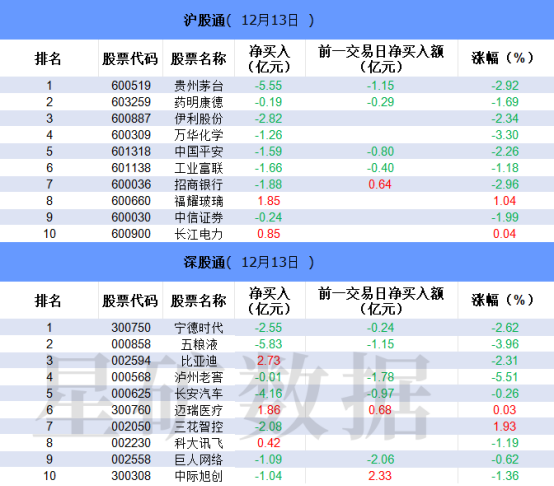 ①沪深股通前十大成交中,五粮液、贵州茅台净卖出分居前两位,均遭北向资金净卖出超5亿。