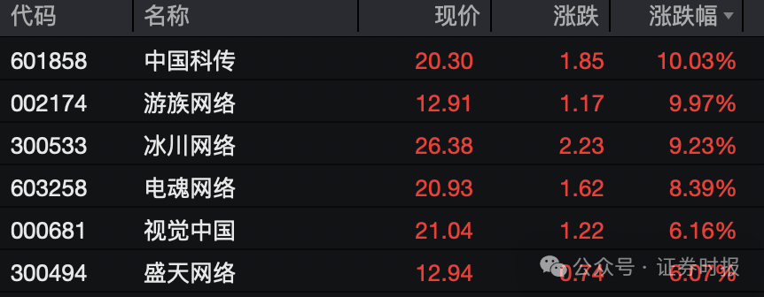 行业板块方面,若按照申万一级行业划分,传媒板块领涨,板块盘中涨幅一度超过2%,冰川网络盘中涨幅一度超过15%,中国科传、游族网络等涨停。计算机、环保、电子等板块涨幅居于前列。