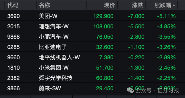 恒生科技指数成份股中,美团-W领跌,跌幅超过5%,理想汽车-W、小鹏汽车-W、小米集团-W、蔚来-SW等汽车股亦下跌;腾讯音乐-SW、哔哩哔哩-W等领涨。
