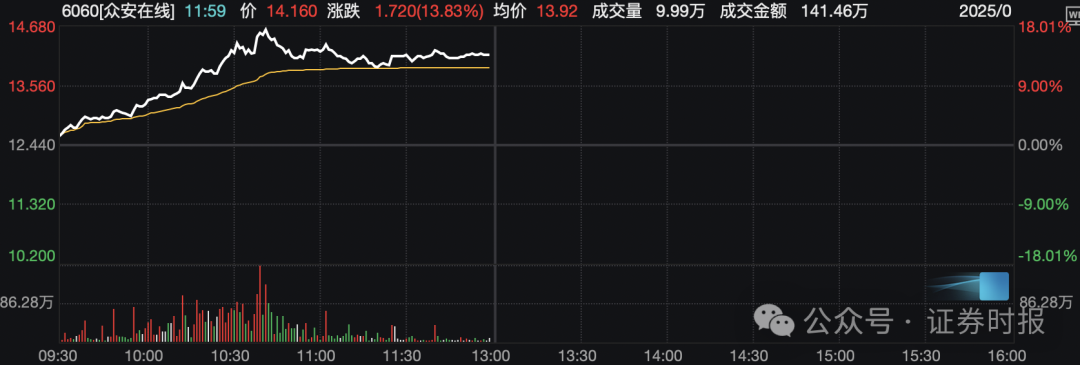 异动个股方面,众安在线大涨,盘中涨幅一度超过18%。