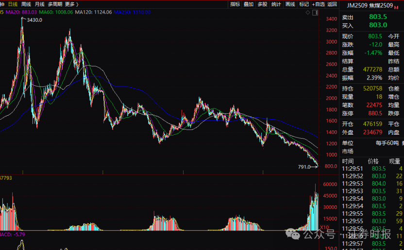 期货市场方面,焦煤期货连续下跌,国内焦煤期货主力合约盘中跌幅超过1%,再创阶段新低,年内焦煤期货主力合约累计跌幅已超过30%。