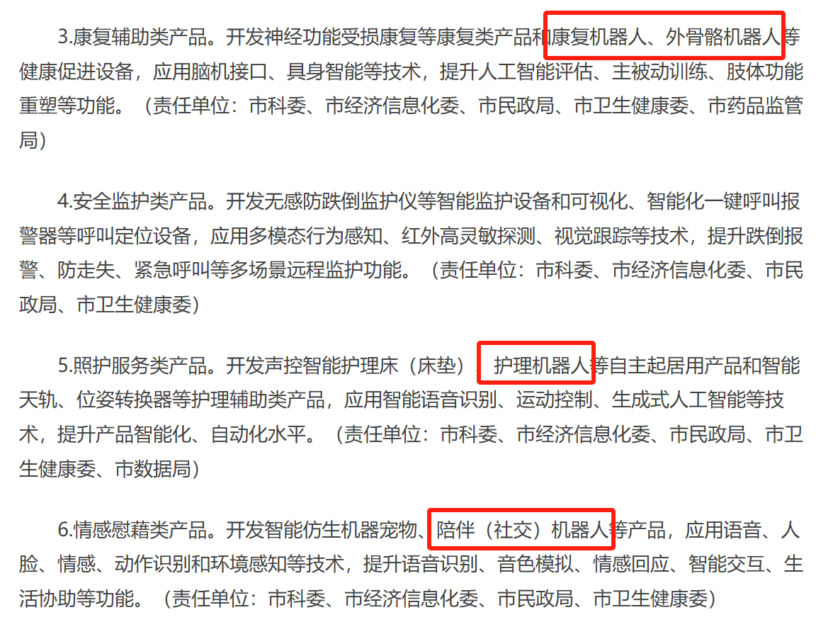 《科创板日报》注意到,在重点产品开发方面,《方案》划分出“生活辅助”“健康服务”“康复辅助”等六个类别,其中“机器人”字样则是被多次提及,包括但不限于“康复机器人”“外骨骼机器人”“护理机器人”“陪伴机器人”等。