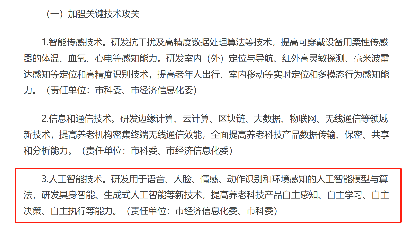 《方案》提到,要加强技术攻关、产品开发和服务平台建设。其中提到人工智能技术,要研发用于语音、人脸、情感、动作识别和环境感知的人工智能模型与算法,研发具身智能、生成式人工智能等新技术,提高养老科技产品自主感知、自主学习、自主决策、自主执行等能力。