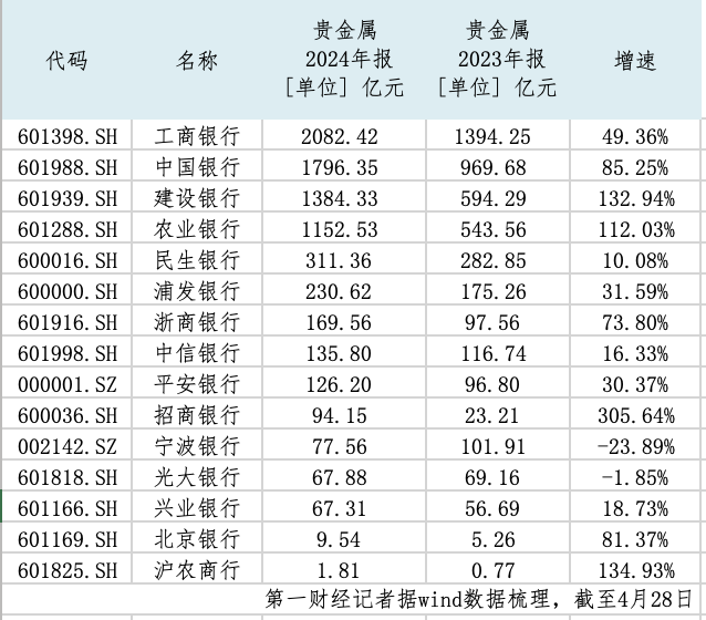 Wind数据显示,目前有18家上市银行披露了2024年末贵金属资产规模,合计为7708.78亿元,较2023年末增长约70.2%。其中,国有银行贵金属资产规模增长较快。根据财报,截至2024年末,工商银行、中国银行、建设银行、农业银行贵金属资产规模合计为6415亿元,较2023年末增长约83.23%。