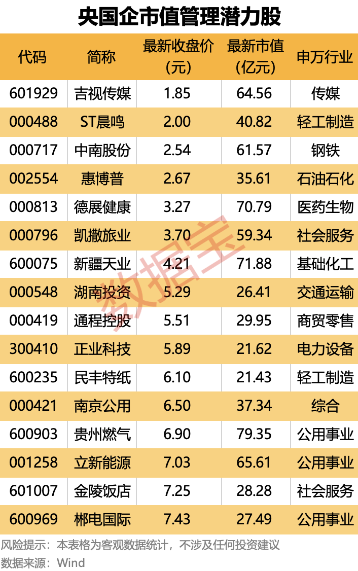 证券时报·数据宝在发布了市值管理制度的A股央国企上市公司中,以昨日(5月29日)公司股价低于8元、市值低于80亿元为条件筛选,16只个股浮出水面。