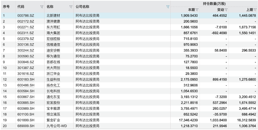 紧随其后的是生益科技,本期持仓2175.10万股,环比加仓899.42万股,持仓市值为6.56亿元;以及宝丰能源和北新建材,持仓分别为3755.50万股和1909.54万股,市值为6.06亿元和5.06亿元,也均处于其A股组合的核心梯队。上述标的主要分布于化工、新材料、建材等行业,也反映出阿布达比对制造链条中具有成本优势和业绩稳定性的龙头公司更为偏好。