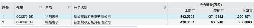 从具体持仓看,GIC本期对高端装备股柏楚电子进行了加仓,增持90.62万股,合计持仓达428.31万股,持仓市值达5.64亿元,显示出其在智能装备与电力设备方向上的延续性关注。对华明装备减持374.39万股,持仓仍有982.57万股,对应市值为1.64亿元。