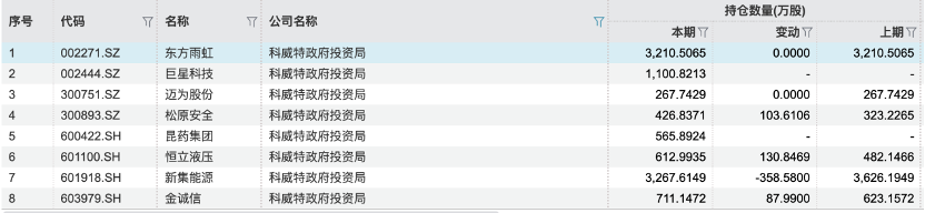 值得注意的是,科威特政府投资局本期还新进买入了昆药集团,持股为565.89万股,市值为8097.92万元,也新进到巨星科技的前十大流通股中,持股1100.82万股,持仓市值为2.81亿元。