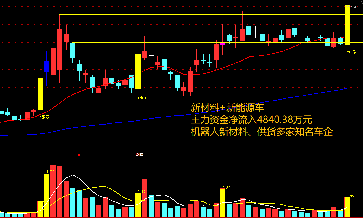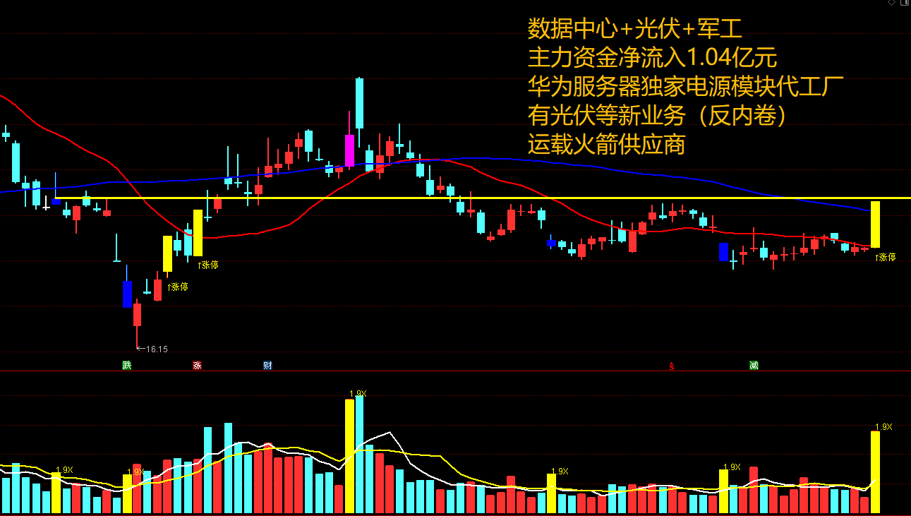 技术上,股价在18日均线附近数倍量涨停,18,90即将收敛金叉,短期若维持量能突破并站稳支撑,则符合首板量价关系,可以结合方法着重学习。