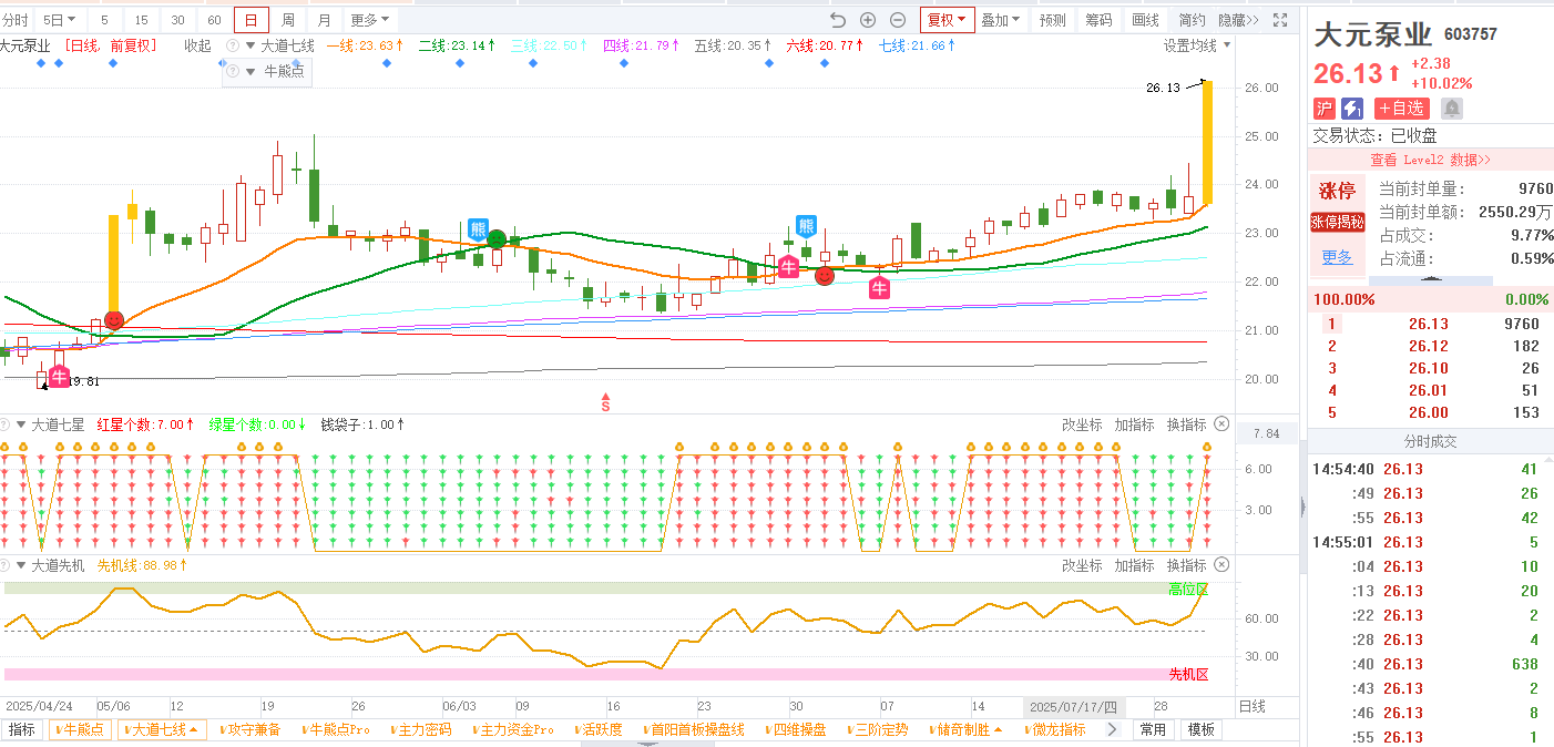 2)20250731-大元泵业-603757-大道七线-日线出现笑脸信号,且大道七星全红;