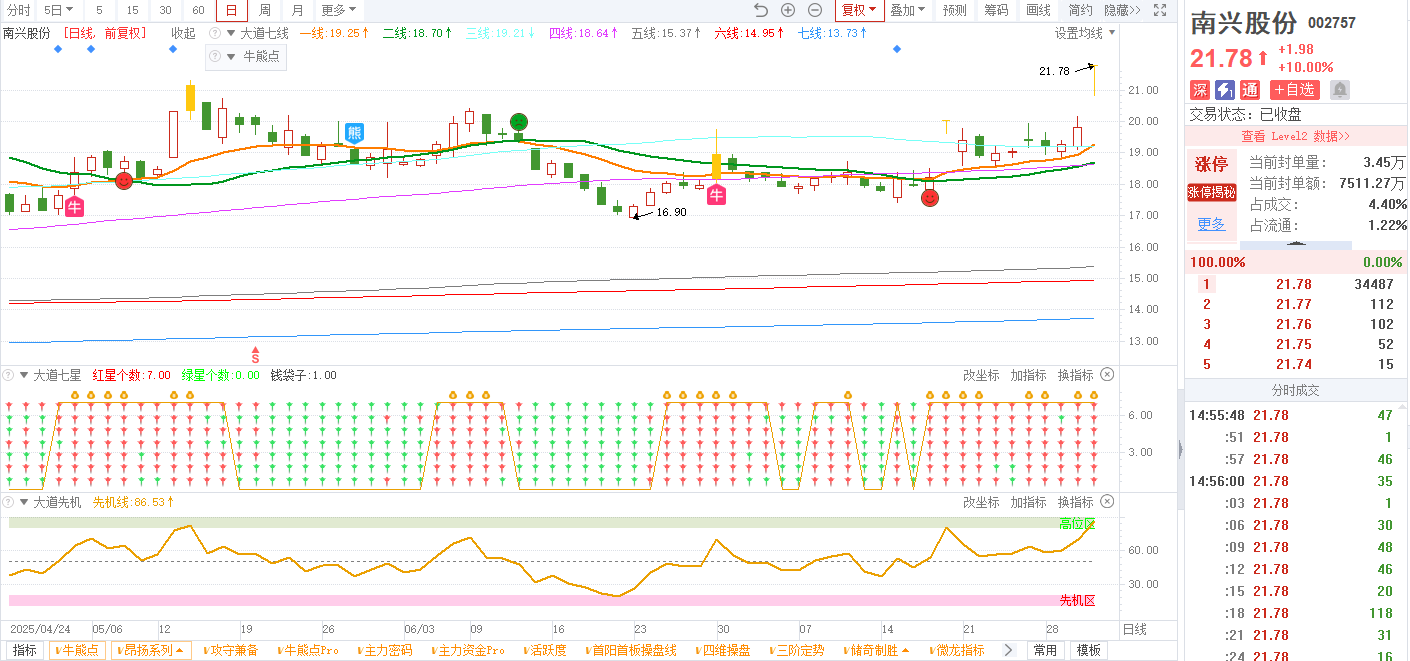 3)参考技术指标:20250731-南兴股份-002757-大道七线-日线出现笑脸信号,且大道七星全红;牛熊点指标-日线出现牛点信号