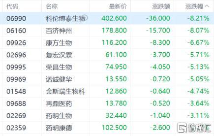 生物医药股大跌,科伦博泰生物、百济神州跌超8%,康方生物跌超6%,复宏汉霖、荣昌生物、诺诚建华跌超5%。