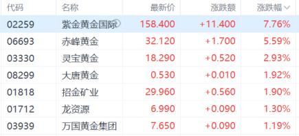 黄金及贵金属股走强,紫金黄金国际涨超7%领衔,赤峰黄金涨超5%,灵宝黄金、大唐黄金、招金矿业等跟涨。