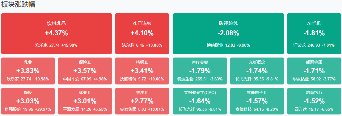 板块方面,保险、乳业、零售等板块涨幅居前,算力硬件、影视院线等板块跌幅居前。截至收盘,沪指跌0.11%,深成指跌0.71%,创业板指跌1.29%。