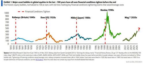 美银在报告中强调,重大技术变革与资产泡沫之间存在不可分割的历史联系。19世纪英国第一次工业革命引发了铁路股票的多次繁荣,美国20年代的咆哮源于汽车、收音机和电子产品的发明,而互联网催生了90年代末的科技泡沫。