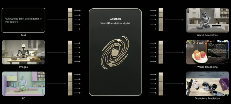 现在使用以物理定律为基础和条件、以基准真理为基础和条件的合成数据生成(Synthetic Data Generation),我们可以选择性地、巧妙地生成我们可以用来训练 AI 的数据。例如,进入左边这个 Cosmos AI 世界模型的是交通模拟器的输出。现在这个交通模拟器对于 AI 学习来说远远不够。我们可以把它放入 Cosmos 基础模型中,生成基于物理且在物理上合理的环绕视频,AI 现在可以从中学习。这方面有很多例子。让我向你们展示 Cosmos 能做什么。