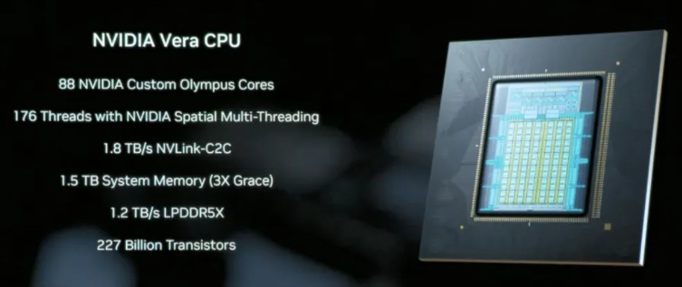 CPU黑科技: 全新的Vera CPU集成了88个定制Olympus Arm核心,采用了一种名为“空间多线程”(Spatial Multi-threading)的设计,可同时高效运行176个线程,解决了CPU跟不上GPU吞吐的痛点。