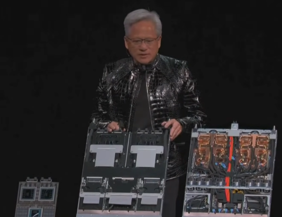 这个位于这些机架背板上的交换机使我们能够移动相当于全球互联网数据量两倍的数据,以两倍于所有世界互联网数据的速度。将整个星球互联网的横截面带宽算作大约每秒 100 TB。这是每秒 240 TB。所以这让大家有个概念。这是为了让每一个 GPU 可以在完全相同的时间与每一个其他 GPU 一起工作。
