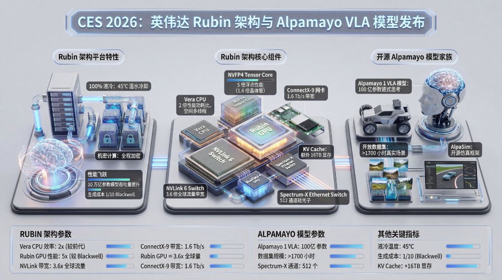 Vera Rubin平台全面投产:新一代AI计算平台的全部六款核心芯片已完成制造和关键测试,已进入全面生产阶段。在晶体管仅增长1.6倍的物理极限下,通过“极端协同设计”强行实现5倍推理性能提升,训练性能提升3.5倍。微软下一代AI超级工厂将部署数十万颗Vera Rubin芯片。
