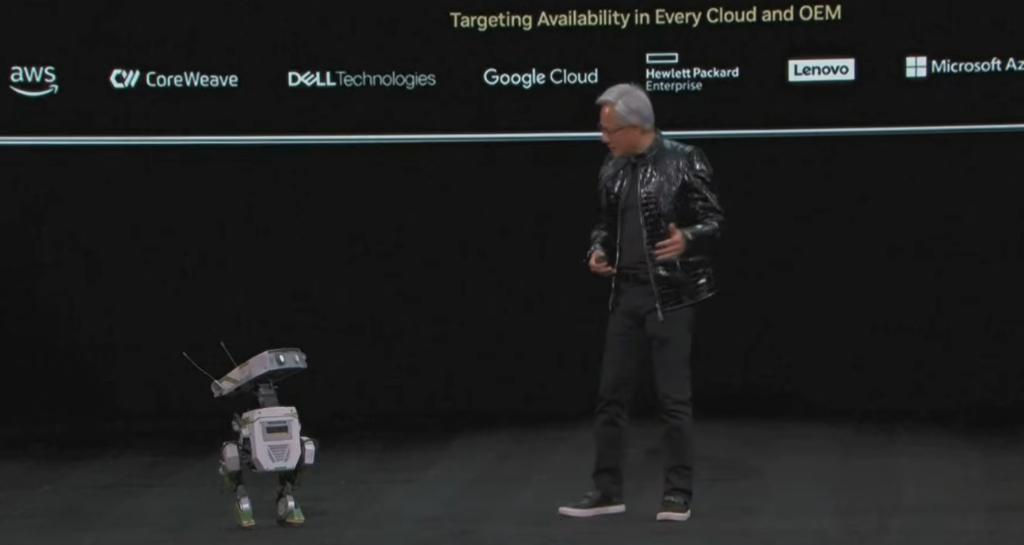 但我刚才描述的这种使用三台计算机、使用合成数据生成和模拟的基本技术适用于每一种形式的机器人系统。它可以是一个仅仅是关节、机械手的机器人,也许是一个移动机器人,也许是一个完全的人形机器人。所以机器人系统的下一个旅程、下一个时代将是机器人。这些机器人将有各种不同的尺寸。我邀请了一些朋友。他们来了吗?嘿,伙计们,快点。我有很多东西要讲。来吧,快点。你告诉 R2D2 你会在这儿吗?C-3PO。好的。好的。到这儿来。