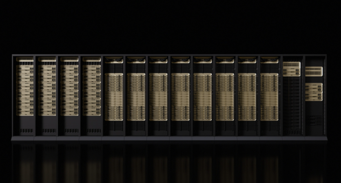 这总共有两英里的铜缆,5,000 根铜缆。这使得 NVLink Spine 成为可能。这是真正开启了 NGX 系统的革命,我们决定创建一个行业标准系统,以便整个生态系统、我们所有的供应链都可以标准化这些组件。有大约 80,000 个不同的组件组成了这些 NGX 系统。